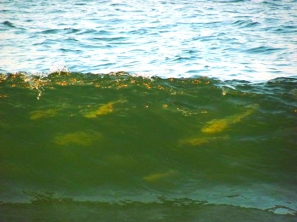 And then, gazing out on the water, we noticed a single fish jump – and then another and another. They were swimming quickly northward and popping out of the water as they raced, some as big as a foot long.  There were hundreds, which became thousands within moments. And the most amazing thing happened. As we looked into the transparent, glassy, green waves breaking in the light of the setting sun,  each was filled with fish! End to end, big silver fish formed a visible wall of life under the surface.  And they kept coming – millions of shimmery fish making the waves silver, leaping and splashing.  The water was lousy with fish!  For a couple of hours, we sat and watched the miracle. Let’s go for a swim, I suggested. So, for a glorious time,  my husband and I floated amongst the fish, trying to keep still so that they wouldn’t be disturbed.  In all of my years living near the water, I had never experienced anything like it.
